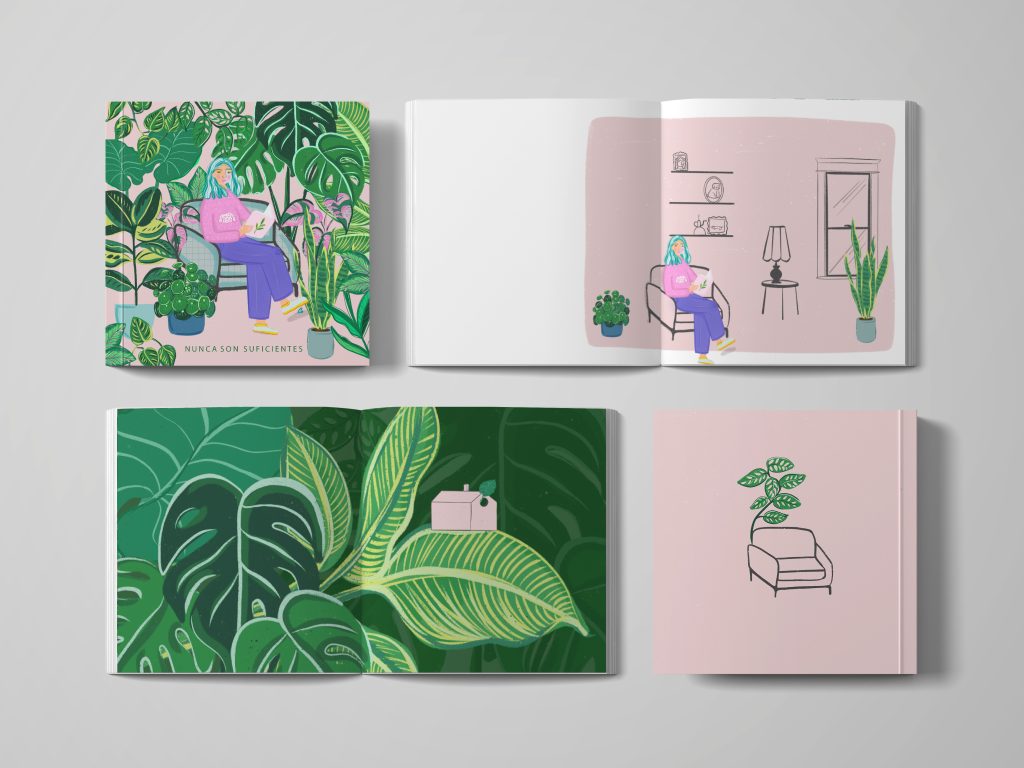 Proyecto álbum ilustrado “NUNCA SON SUFICIENTES”. Idea que plantea la vida de una persona cuando compra su primera planta y no puede detenerse hasta que termina viviendo en una planta.